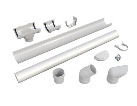 Комплектация: Желоб, 1 м - 1 шт. Желоб, 2 м - 3 шт. Соединитель желоба - 2 шт. Заглушка желоба - 2 шт. Кронштейн желоба - 11 шт. Воронка желоба - 1 шт. Труба, 2 м - 2 шт. Колено трубы 135° - 2 шт. Муфта трубы - 1 шт. Водосточный слив - 1 шт. Хомут трубы - 3 шт. Саморезы по дереву - 32 шт. Инструкция по монтажу - 1 шт.