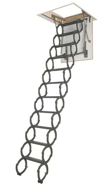 В ассортименте FAKRO есть также и складныечердачные лестницы «ножничного» типа. Такие модели выполнены из металла, защищенного от коррозии. Поставляются совместно с потолочным коробом, позволяющим хранить сложенную чердачную лестницу «в потолке».