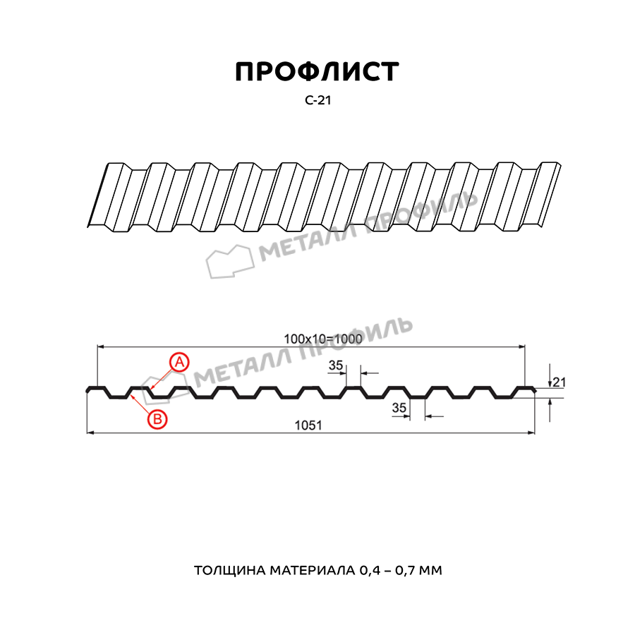 Профиль С-21 имеет трапециевидную форму, что обеспечивает прочность и устойчивость к нагрузкам. Толщина материала составляет 0,7 мм, что делает его идеальным для использования в различных условиях.