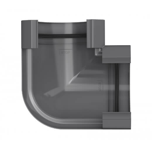 Угол желоба ТЕХНОНИКОЛЬ ПВХ МАКСИ графитово-серый – связующий элемент в водостоке. Используется, чтобы соединить желоба и корректировать направление потока воды.