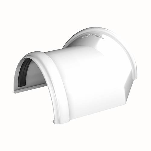 Угол желоба предназначен для соединения желобов на карнизах, которые лежат в одной плоскости, но расположены перпендикулярно относительно друг друга.